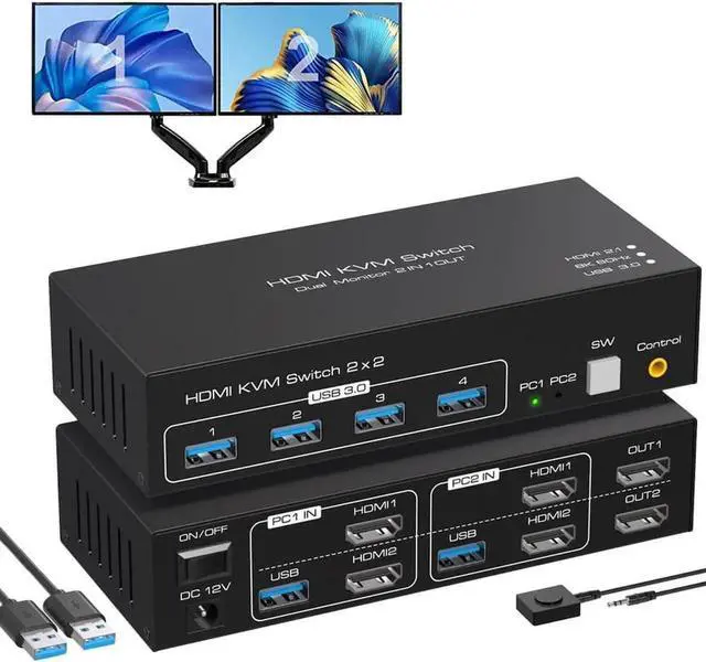 Dual Monitor KVM Switch HDMI 2 computers share 2 monitor and 4 USB 3.0 device