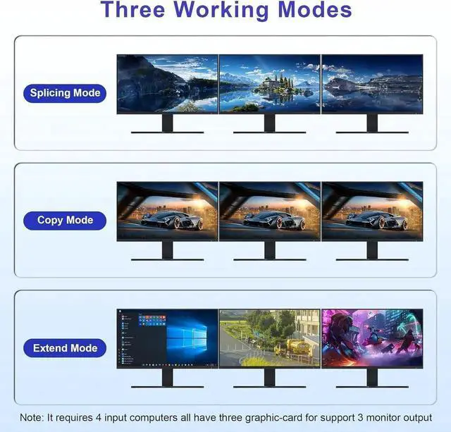 2. Support HDMI 2.1 and DP 1.4 standards and downward compatible. 3 monitors output support up to 8K@60Hz 4K@144Hz for extended, mirrored or spliced display (Depends on your computer's graphics card.) ;