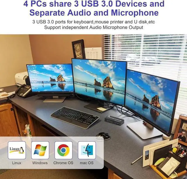 4. KVM switch with 3 USB 3.0 ports for USB devices, and with extra Audio Microphone output.
