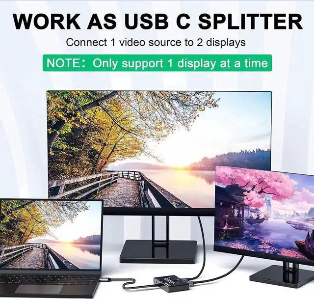 NOTE: Two displays CANNOT display simultaneously. You need to use a standard USB-C USB 3.1 version Gen-2 Cable to connect this switch and use the USB cable to power the switch.