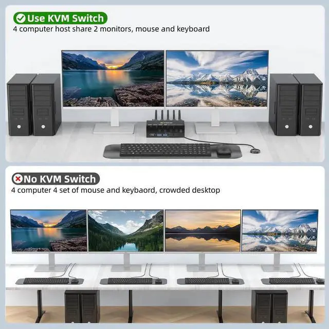 This 2 monitors 4 computers KVM switch with EDID emulators in each input port, keep computers always having correct display information when switch back.