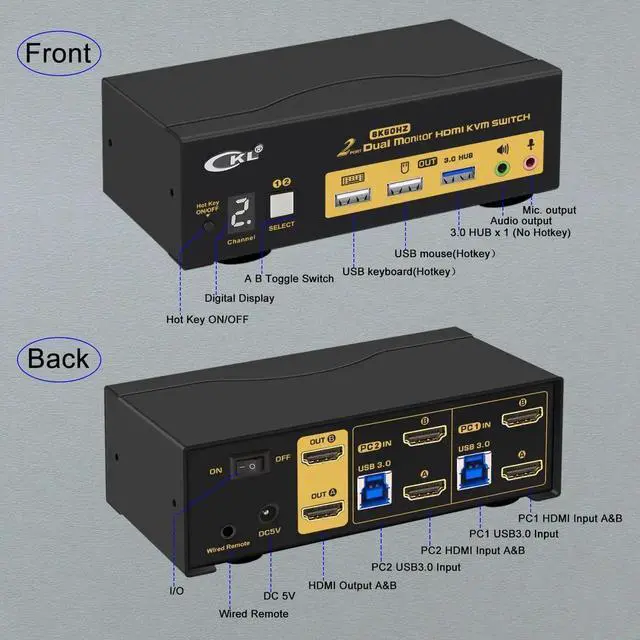 KVM SWITCH DUAL MONITOR 2 PORT: If you have 2 computers or laptops, one for personal or gaming, the other for work, this is a premium tool for you to control them using 1 set of keyboard, mouse and dual extended or mirrored monitors, and share 1 more USB peripheral. Save your space and equipment spending significantly.