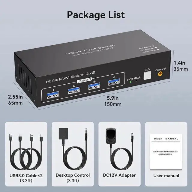 [Two Switching Way] The HDMI KVM Switches supports panel button and external wire controller switching. Using the wired extension button, you can place the KVM outside the work area.