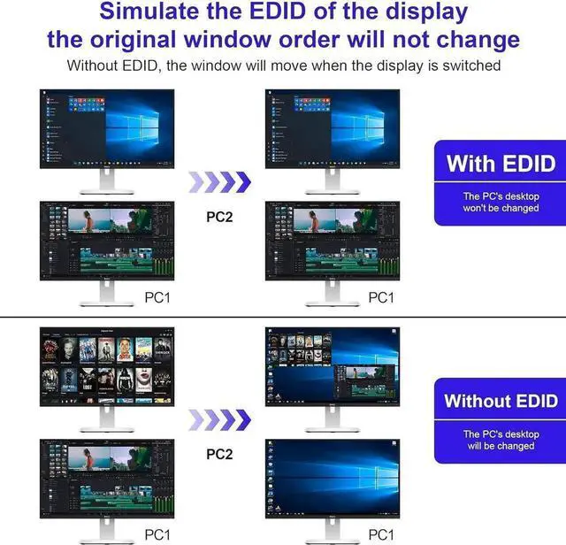Support Simulation EDID: This kvm switches can simulate the EDID of the display, store the resolution and refresh rate of the display.