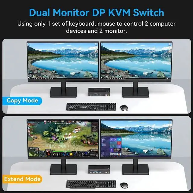 [KVM Switch 2 monitors 2 computers] The DP KVM switch can be connected to 2 computer hosts, sharing 1 set of keyboard, mouse and 2 monitors. Supports copy and expansion modes for computer hosts (computer host graphics card needs to have 2 DP outputs).
