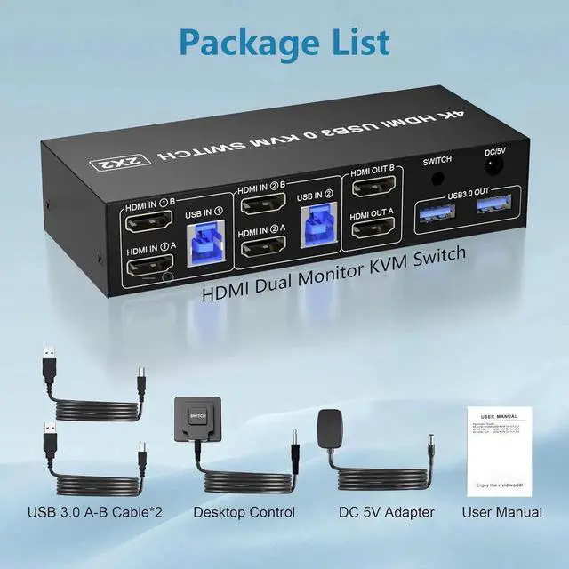Dual monitor HDMI USB switch with 3 USB 3.0 ports for sharing keyboard,mouse,printer,scaner and other USB devices.