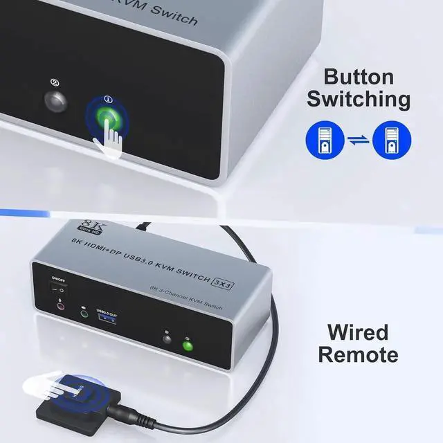 - This kvm switch 3 monitor supporting high resolution max up to 8K@60Hz, and also supports 4K@60Hz or other lower resolution (Downward Compatible).