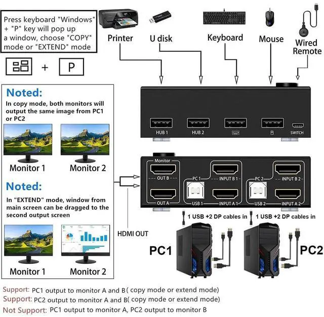 Dual Monitor KVM Switch 2 Computers Share 2 Monitor and 4 USB Devices