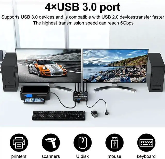 [DisplayPort 1.4 KVM Switches] This dual monitor KVM switches controls 2 PCs or laptops with just one set of keyboard, mouse and 2 monitors. Can view mirrored and extended desktops or display information from two PCs for home office setup, gaming, and streaming device support.