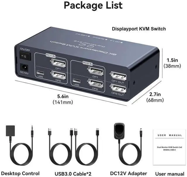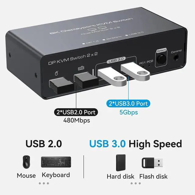 1) 2 channels dual channel DP video + two channels USB input, 1 channel dual channel DP + 2 channels USB 3.0 + 2 channels USB 2.0 HUB output