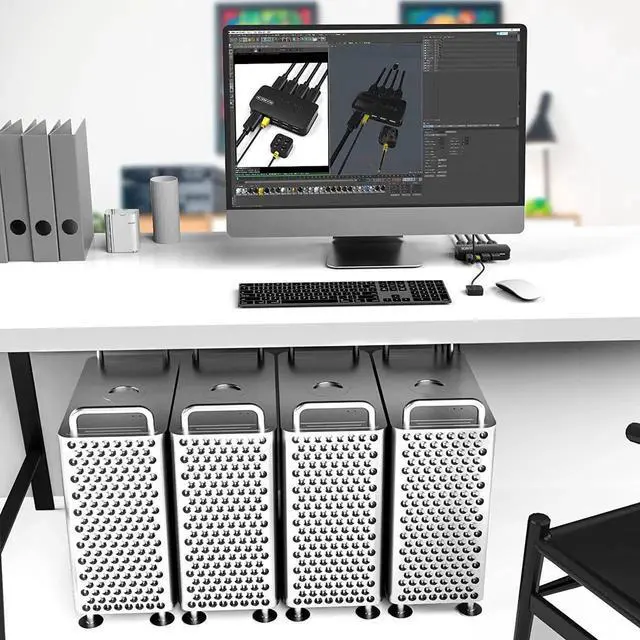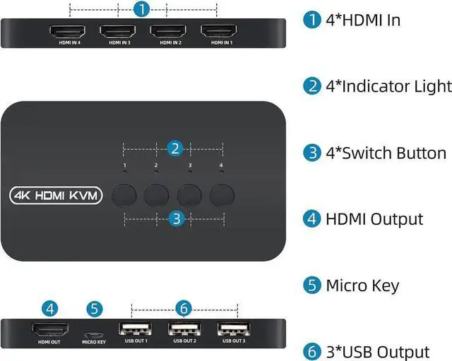 HDMI KVM Switch 4 Ports allows you to manage 4 computers with only 1 monitor + USB/wireless keyboard and mouse and share 1 printer, U disk, USB speaker (only single USB cable) or other USB 2.0 -Devices.