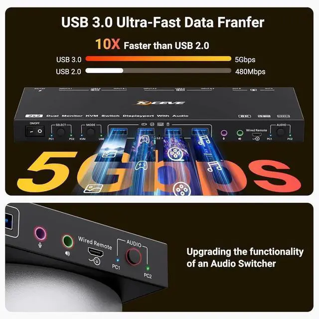 No plug-ins required, this monitor switch for 2 computers is simple plug and play for any modern operating system: Windows, Mac OS, Chrome OS, and Linux computers, etc. You can press the audio button on the kvm switches dual monitor to freely select the audio output and connect your 3.5 mm audio device directly to the kvm 2 monitors 2 computers displayport. Meeting the needs of most clients, dual display port kvm is really a practical choice!