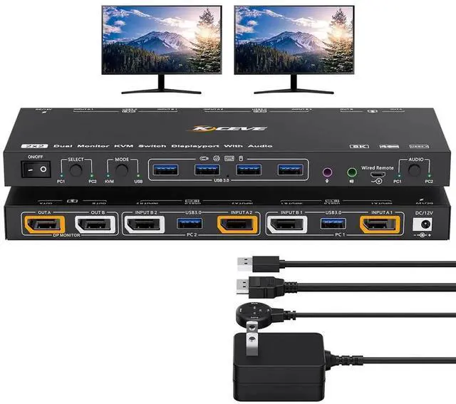 Newly upgraded! With this KVM Switch Displayport, not only can you share two monitors and four USB devices between two computers as before, you are free to choose the KVM/USB mode and also the computer that outputs the audio, no longer fixed as before. Adding a sense of freedom to neatness and efficiency, this dual monitor kvm is really a perfect choice!