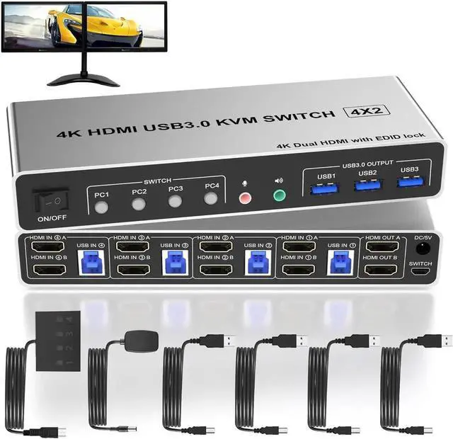 4 port USB 3.0 dual-monitor HDMI KVM Switch (HDMI + HDMI). Each input source device must be connected to two dual-monitor.