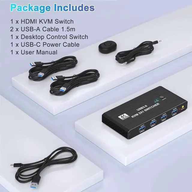 What you will Get: We provide lifetime technical support for this kvm switcher. Package include:1*kvm switcher, 2*USB 3.0 Cable, 1*USB C Power Cable ,1*User Manual. Any problem, pls contact us to solve.