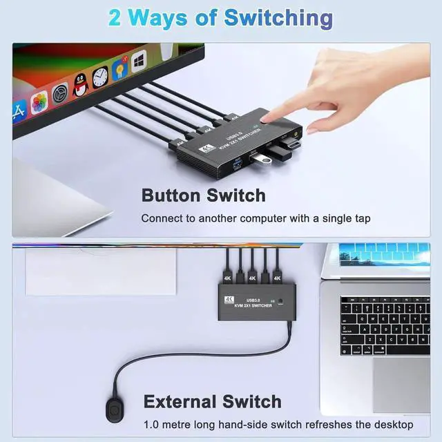 Two Switching MethodsThe 4K HDMI KVM Switch provides two switching methods: KVM switch button and wired remote switch. The wired remote switch allows you to place the HDMI KVM switch in a hidden or distant location, keeping your desktop tidy. Simply place the desktop remote within reach on your desktop for quick access. Seamlessly switch between computers at the touch of a button for increased productivity.