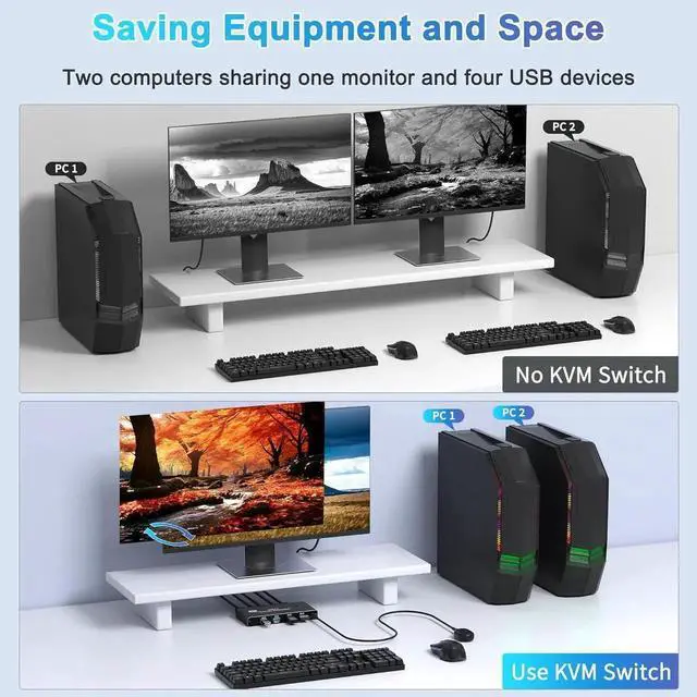 KVM Switch for 1 Monitor 2 Computers: This HDMI KVM switch comes with 2 HDMI ports to control 2 computer hosts, allowing them to share a single monitor, keyboard and mouse. It has four USB ports. This KVM switch also supports a variety of input devices such as PCs, laptops, PS4s and more. It is compatible with Windows 7/8/10/11/Vista/XP, Linux, Mac, and more.