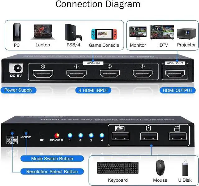 Crossing mode allows keyboard and mouse cross between HDMI sources, which means you can control max 4 computer at the same time.