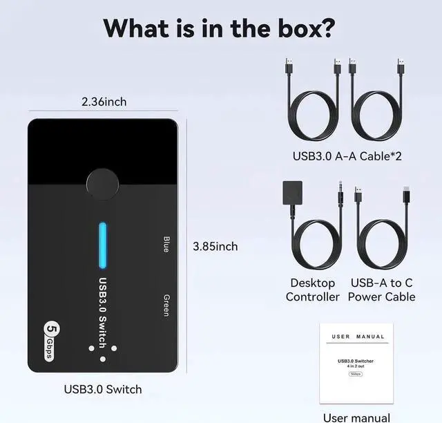 USB 3.0 switcher supports 2 computers sharing 4 USB devices like keyboards, mouses, printers, headphones, and USB cameras. Switch freedom between your work computer and personal computer, keeping your desktop tidy while improving your work efficiency.