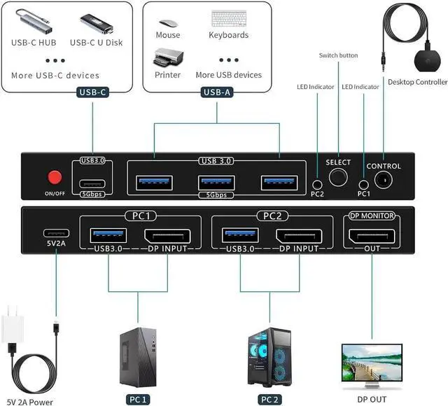 Note 2: 1, This KVM switch is not a HDMI KVM switch or USB-C KVM switch, please make sure your host and monitor have DP ports. 2, If your host and monitor don't have DP interface, you need to use HDMI or USB-C to DP to connect this KVM switch, such as connecting through laptop's typec interface, please make sure to use high quality converter and docking station of famous brand, otherwise there may be compatibility problems.