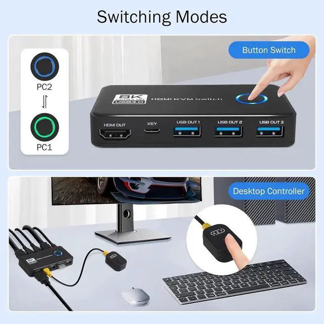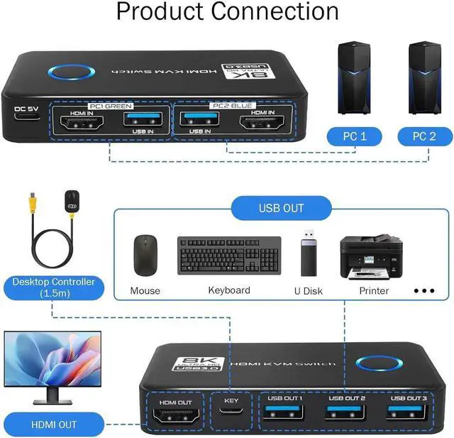 [2 Ports HDMI USB 3.0 KVM Switch]: The KVM switcher allows you to control 2 computers with 1 set of external devices like monitor, mouse, keyboard, etc. Compatible with Windows, Linux, Mac OS, Chrome OS. Works well and with high quality, it's the ideal ch
