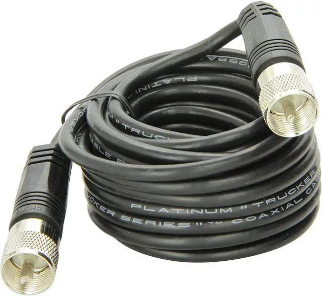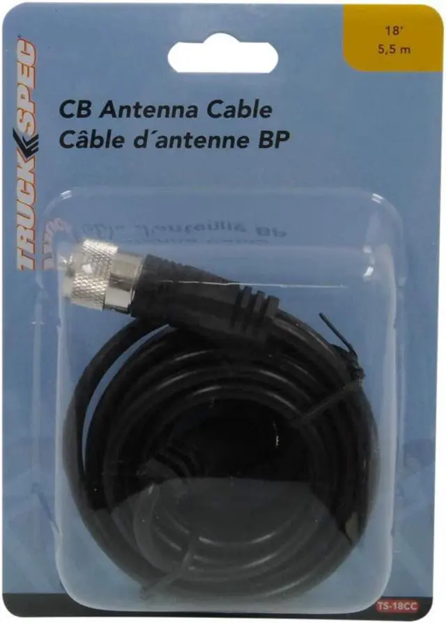 RG-58A/U coaxial cable with molded PL-259 connectors for moisture protection. For use with single CB antenna SO-239 stud mounts. 95 percent shielding coverage for protection of RF leaks and interference. Stranded center conductor for flexibility. CB radio accessories. Antenna cables. From the manufacturer TRUCKSPEC 18' RG-58A/U Coaxial Cable With Pl-259