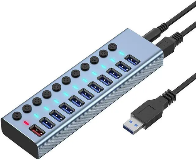• 11 Ports USB3.0 Splitter Computer Extender USB HUB 2.4A Fast Charging Port External 12V Power Supply -US Plug