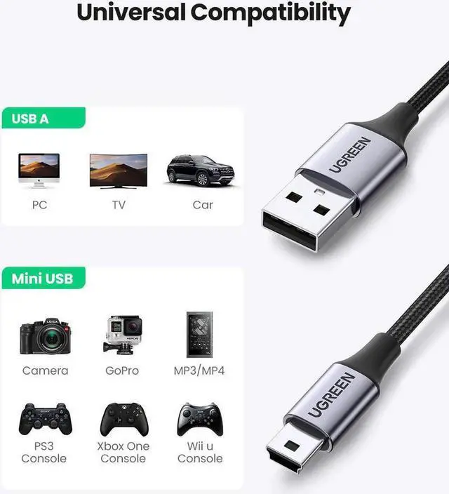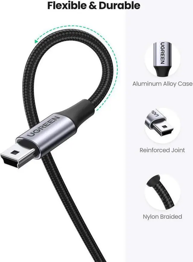 • Aomoproing UGREEN Mini USB Cable USB 2.0 Type A to Mini B Cable Nylon Braided Charging Cord Compatible for GoPro Hero 3 Hero HD PS3 Controller MP3 Player Dash Cam Digital Camera GPS Receiver PDA 10FT