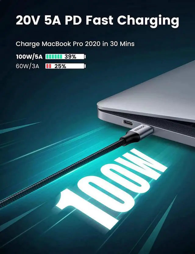• 100W PD Blazing-fast Charge: The max 100W (20V 5A) output brings even large laptops to charge at full speed, juicing up your MacBook Pro 16\u2019\u2019 to 39% in 30mins or fully charging Samsung Galaxy S21 in 60mins, which is 52% faster than a 60W USB C cable.