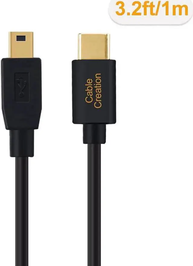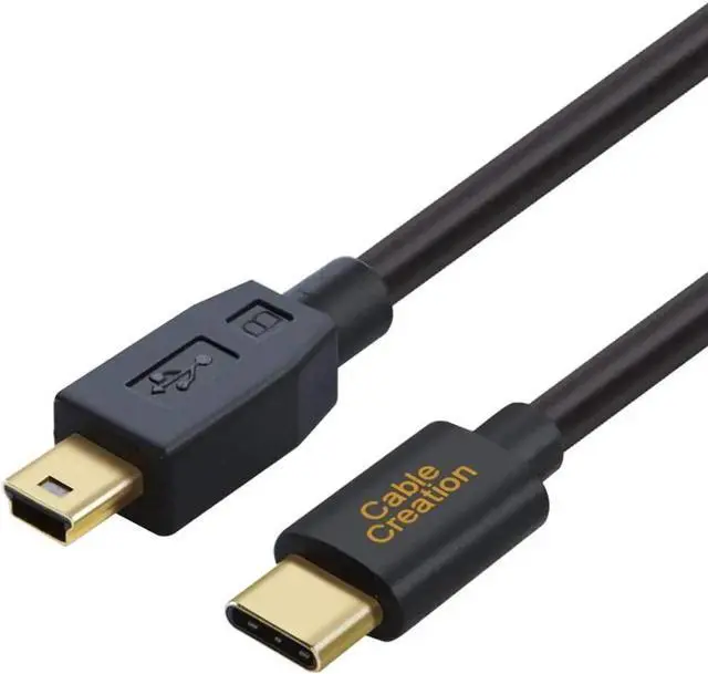 USB C to Mini USB cable connects a computer with a Type-C USB port to legacy USB peripheral device with a Mini B USB port for syncing and charging.