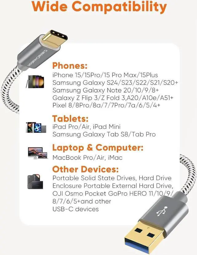 Great Compatibility: This USB A to C cable is compatible with USB C External SSD and other USB-C/Thunderbolt 3 devices. Works Perfectly with all OTG Phones, Such as Galaxy S24/S24 Ultra/S24+/S23, iPhone 15/15 Pro Max /15 Plus/iPhone 16 / iPhone16 Plus / iPhone 16 Pro Max, and More...