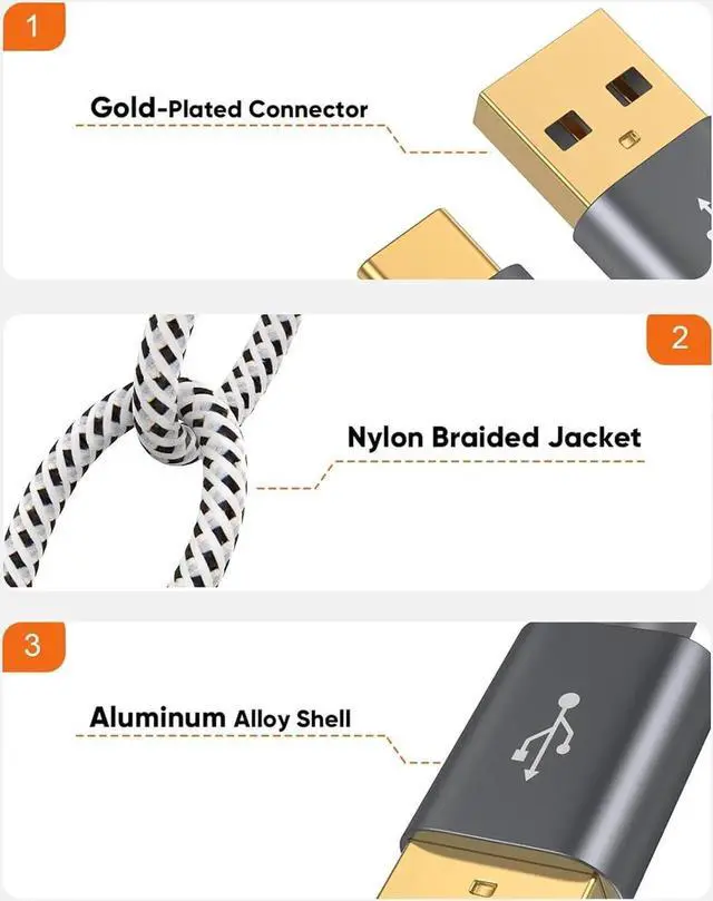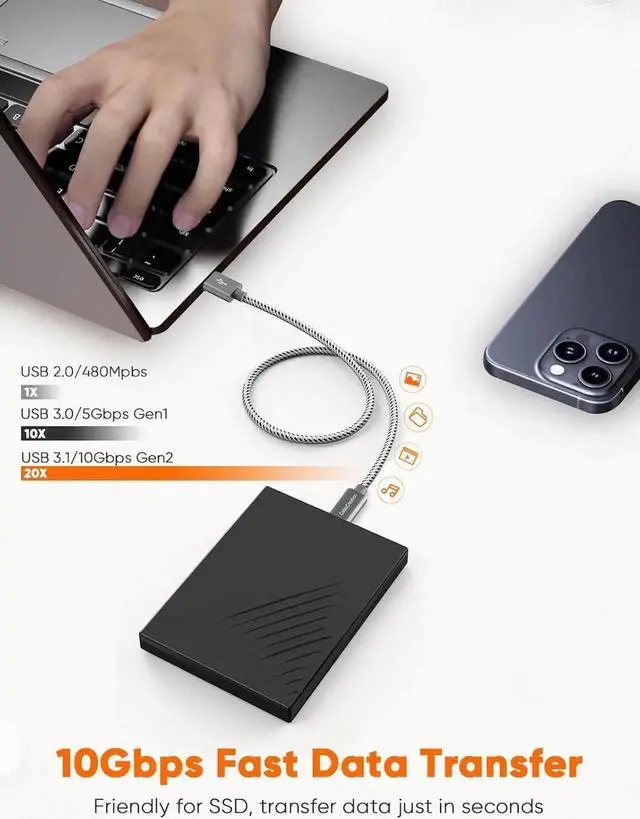 • USB 3.2 10Gbps Data Transfer: Gen2 USB 3.2 Type-A to Type-C Cable supports super speed data transmission up to 10Gbps. You can transfer HD movies or songs in seconds with your USB C SSD (Note: This cable does not support data transfer or charging between two laptops, nor does it support video output, USB 3.2 is backward Compatible with USB 3.1, USB 3.0, USB 2.0 )