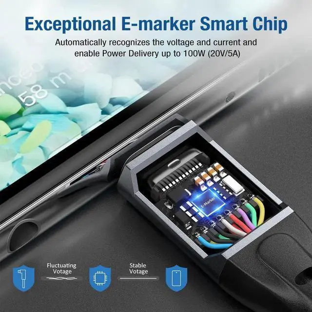 100W Rapid & Safe Charge The USB C to C cable utilizes an E-marker chip to safely deliver up to 100W (5A) of power and supports up to 5A at 5V, 12V, and 20V of power output for fast charging. Fully compatible with PD 3.0 / 2.0, QC 4.0 / 3.0, Samsung AFC and SCP. If you're in a hurry, this cable is the perfect charging option, spare your time whenever and wherever.