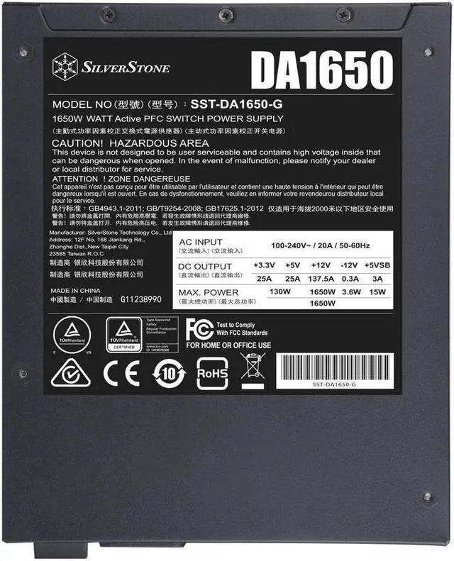 Introducing the SilverStone DA1650, a pinnacle of power supply technology from zonpor's esteemed Decathlon series. This 80 PLUS Gold 1650W fully modular ATX power supply is designed to meet the demands of the most discerning computer hardware enthusiasts. With an exceptional power output rated up to 1650W at 50°C, it ensures clean, stable power with ±2% regulation, making it ideal for ultra-high-end PCs and multi-CPU/GPU workstations. The DA1650's compact design facilitates seamless integration into a wide range of cases and enclosures, providing both flexibility and efficiency. Experience unparalleled performance and reliability with the SilverStone DA1650, the ultimate choice for those who require robust power solutions in their advanced computing setups.