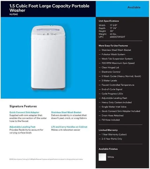 1.5 Cu. Ft. Capacity Stainless Steel Drum 4 Wash Cycles 2 Options 4 Water Levels Clear Plastic Window with Hinged Lid Electronic Control with LED Display 800 RPM Max Spin Speed Quick Connect Sink Adapter Included Lift and Carry Handles