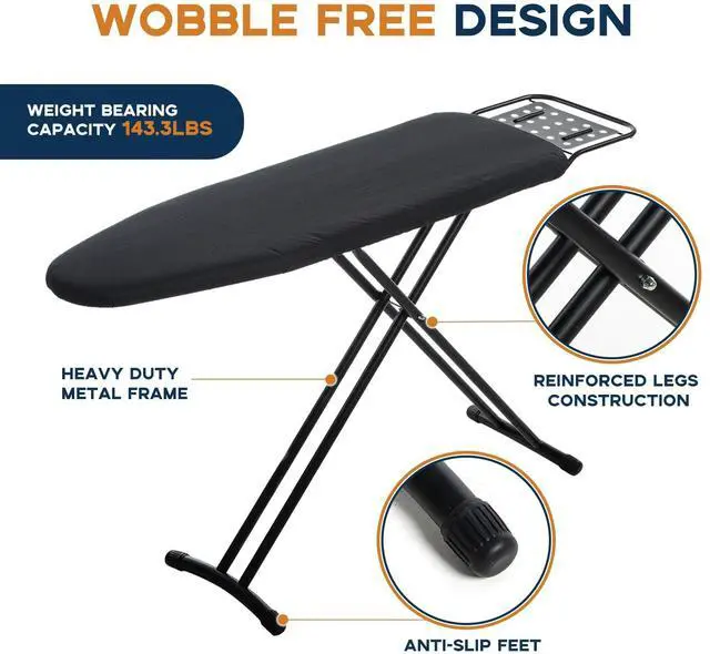 The RAINHOL Full Size Ironing Board comes with an ironing rest space, steel frame, and metal mesh plate for durability. The height of the iron stand is adjustable and its opening dimensions are 54.33"L x 13.38" W x (27.55"-35")H. This heavy duty ironing board also comes with padded heat-resistant cotton iron board cover for quick ironing, and the non-slip steel legs and stabilizing steel frame maintain overall stability, prevent wobbling and ensure safety. Easy to store and use, perfect for apartments, laundry rooms.