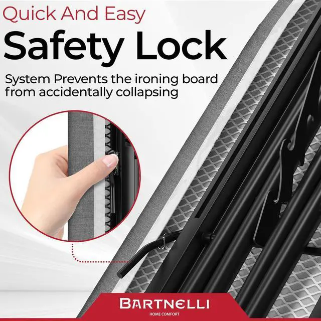 Bartnelli Ironing Board Made in Europe | Iron Board with 4 Layered Cover & Pad, Height Adjustable up to 36" Features A Safety Iron Rest, 4 Steel Legs, for Home Laundry Room or Dorm Use (43x13)