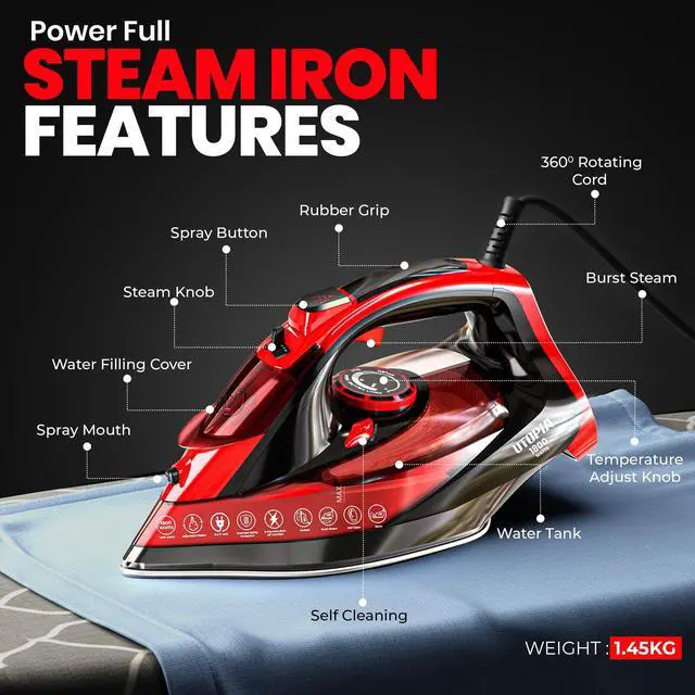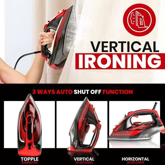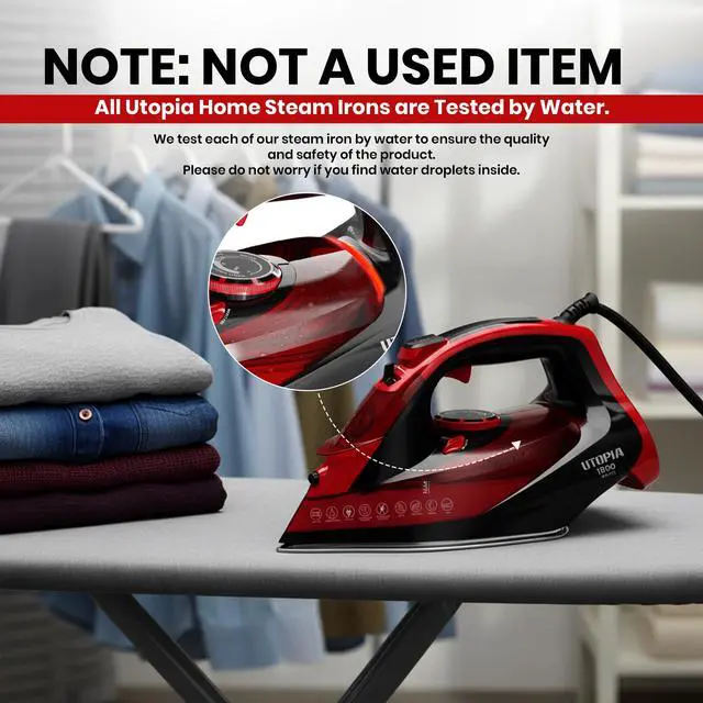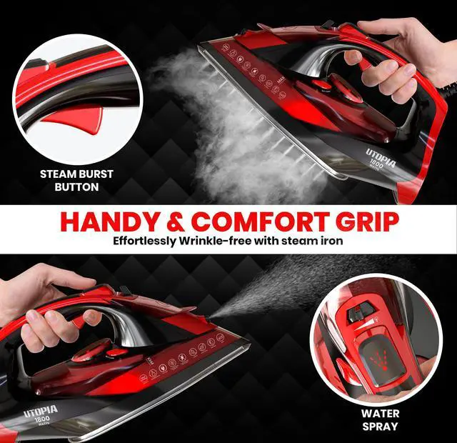 Achieve effortless wrinkle removal with the Utopia Home Premium Steam Iron, powered by 1800W for fast heating and consistent performance. Its non-stick soleplate glides smoothly across all fabrics, while adjustable thermostat and variable steam controls ensure precision ironing. Designed with safety in mind, the auto-off feature provides peace of mind during use. The self-clean function and long 8-foot cord add convenience for everyday ironing.