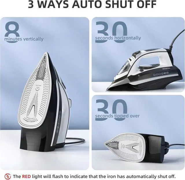 [3-Way Auto Shutoff] Our irons feature an automatic shut-off safety feature that activates the automatic shut-off system after 30 seconds when placed horizontally, 30 seconds when placed on its side, and 8 minutes when placed vertically, giving you peace of mind and preventing accidents