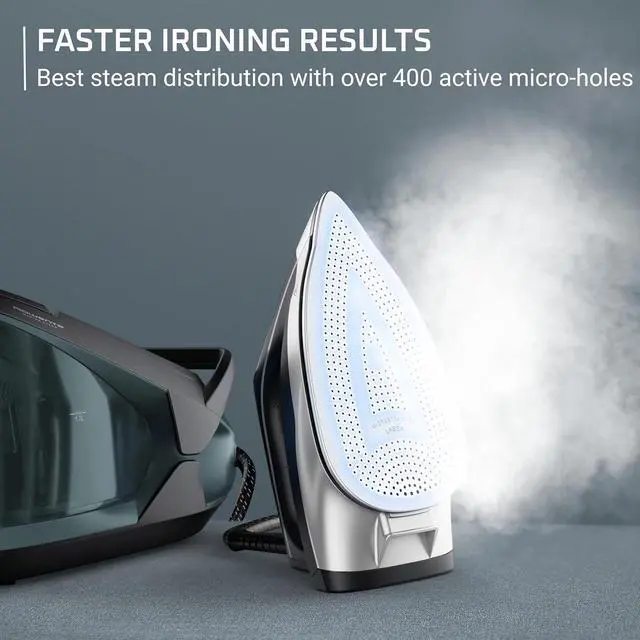 FAST DEWRINKLING RESULTS: High-quality stainless steel soleplate equipped with 400 active micro-holes delivers maximum steam distributionoffering flawless glide and total efficiency for ironing on your ironing board