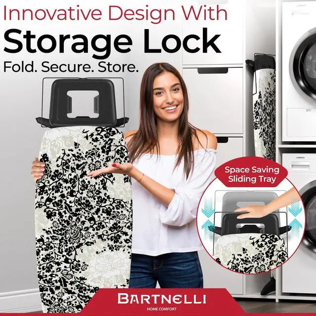 CUSTOMIZE TO YOUR HEART' S CONTENT HEIGHT & STORAGE, SOLVED! What if your ironing board could fit you perfectly and vanish out of sight when not needed? Say hello to adjustable heights and easy folding with a secure lock for storage. Tailor it to your comfort, then tuck it away without a second thought. Finally, a board that adapts to your life, not the other way around. Comfort and convenience? Check and check!