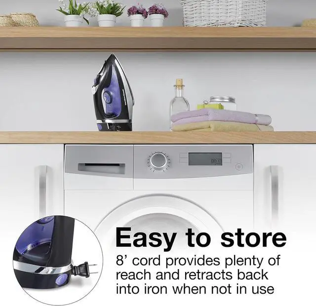 EASY TO STORE: The 8 foot retractable cord provides plenty of ironing reach and retracts back into the iron for easy storage when not in use.
