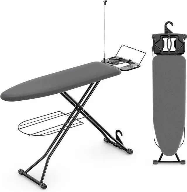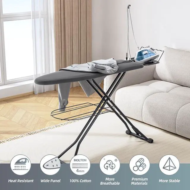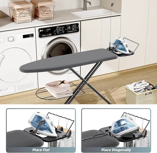 Multifunctional Iron Rest: The ironing board not only has sturdy iron rest but with three-level adjustable silicone irons harness, a flexible iron cord minder and a clothes hanger. Offers options for placing different types of irons. Save time for ironing, making ironing a breeze