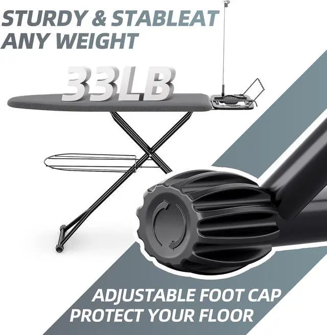Sturdy & Durable Structure: Built with heavy-duty components, our ironing board showcases an unyielding and long-lasting design. The thickened metal legs and adjustable foot cap, supports and this ironing table remains stable and wobble-free during use. There has a garment rack at the bottom for storing clothes
