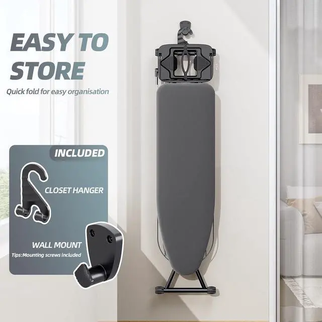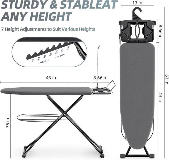 Adjustable & Space Saving: Our ironing board with 7 height settings, ranging from 27 inches to 35 inches to ensure a perfect fit for your height, and the safety latch design prevents accidental opening or closing. The iron stand foldable, hook design allows for easy hanging without taking up too much indoor space
