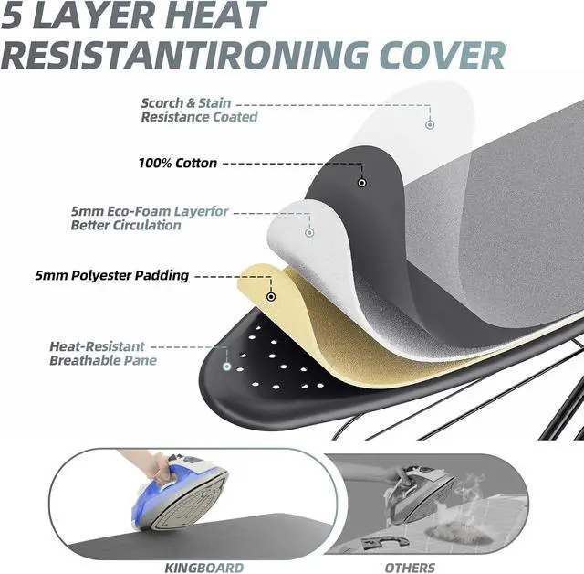 Heat-Resistant 3-Layer Cover: This ironing board cover with 5mm needle-punch cotton, 5mm sponge padding and heat-resistant fabric effectively preventing being damaged due to high temperature during ironing, ensuring long-term and stable use. Specially treated, the surface of the cloth cover has super wear resistance