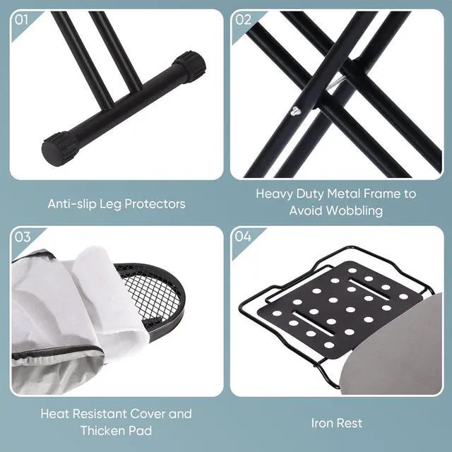 Steel Mesh Top Ironing Board13" x43" mesh top surface iron area, while the non-skid feet can protect your tile or wood flooring. 7 different height adjusted levels, also as a lock to prevent ironing board collapsing accidentally, ironing table can be raised up from 29" to 35", you can sit on sofa for ironing.