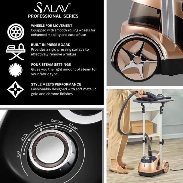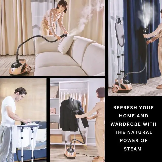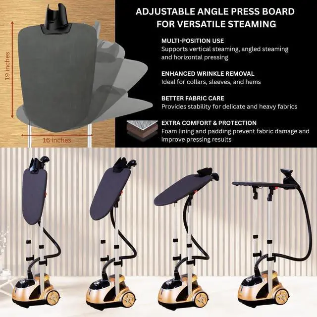 FUNCTIONAL ELEGANCE - Crafted with a dual-bar, telescopic frame for easy storage, a temperature regulating stainless steel steam plate, and built-in wheels for convenient movement across the home. This unit combines performance and beauty with its sleek metallic & chrome finishes