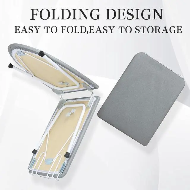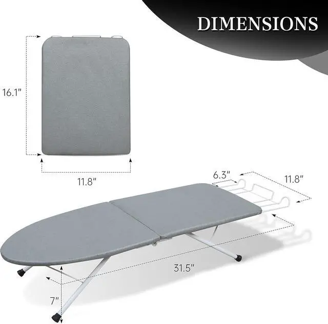 TABLE TOP IRONING BOARDAllows you to iron in a bedroom where you can easily sort clothes or near the washer and dryer when clothes are still warm. The legs & board fold for easy storage.