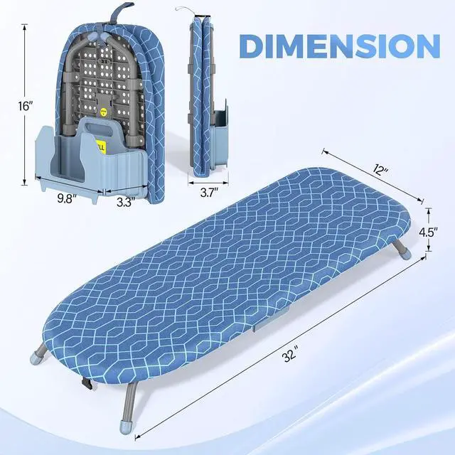 AMAZING SPACE-SAVING- The unique folding allows the ironing board to fold completely in half. After folding, it measures 12" x16" and fits anywhere where space is limited. The iron board measures 32" x12". (Iron Not Included)